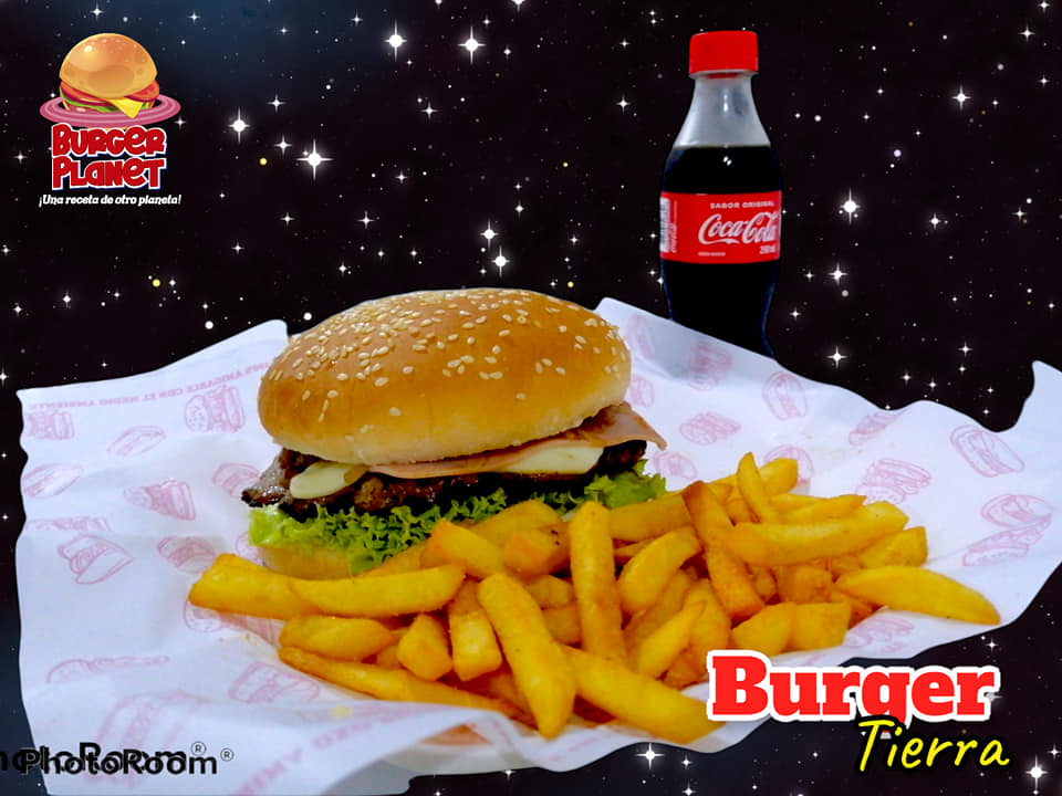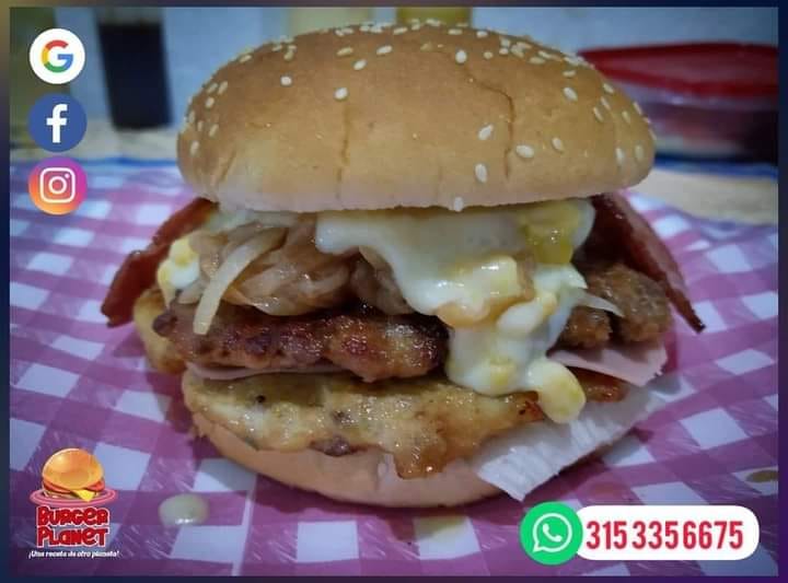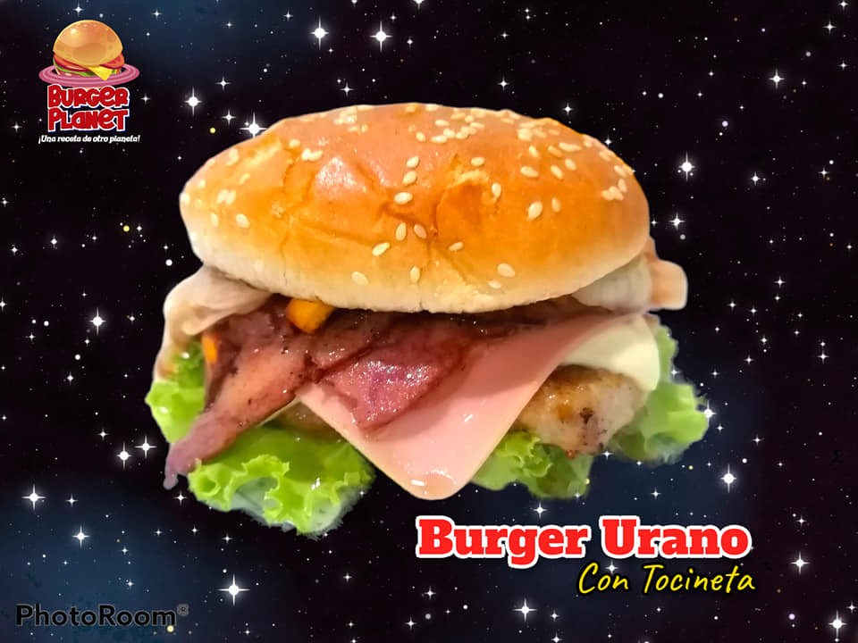 En #BurgerPlanet en contraras hamburguesas de #CarneTrifásica como la #Neptuno de #Pan o #Platano acompañada de #DobleCarne #TripleQuesoYMaiz #VerdurasFrescas y #tocineta #UnaRecetaDeOtroPlaneta