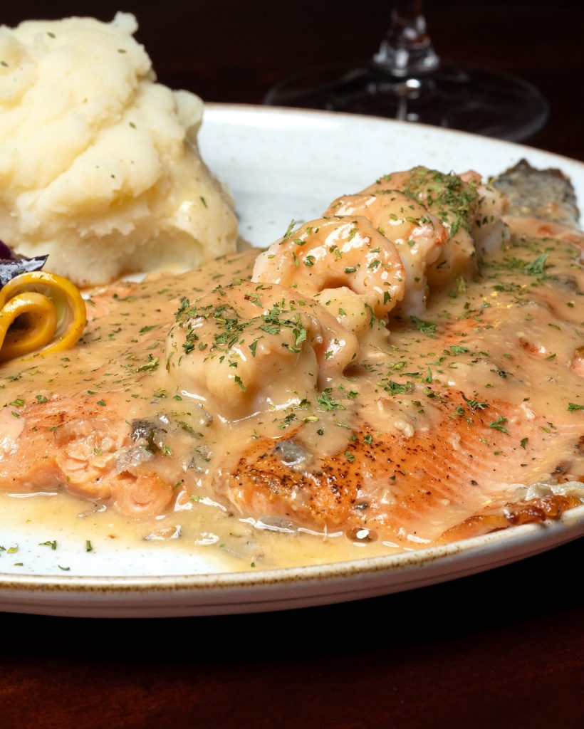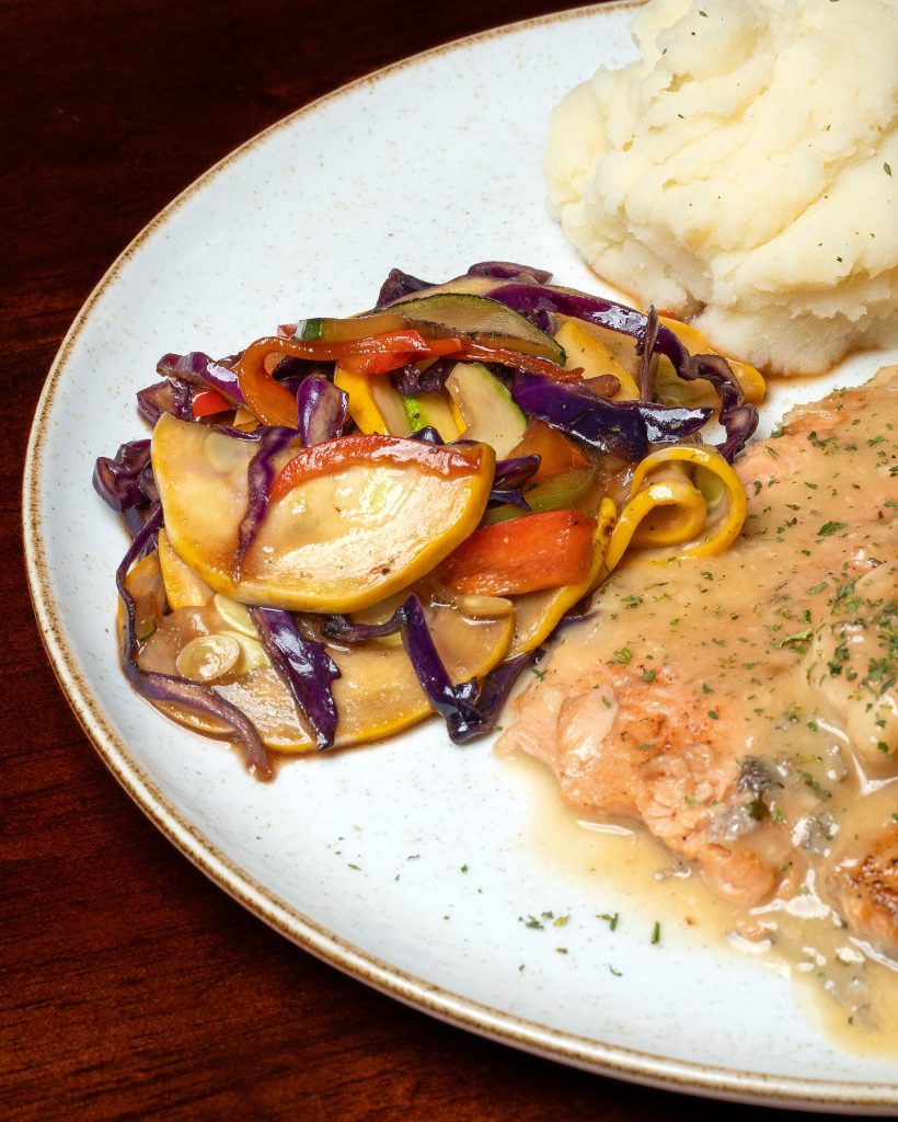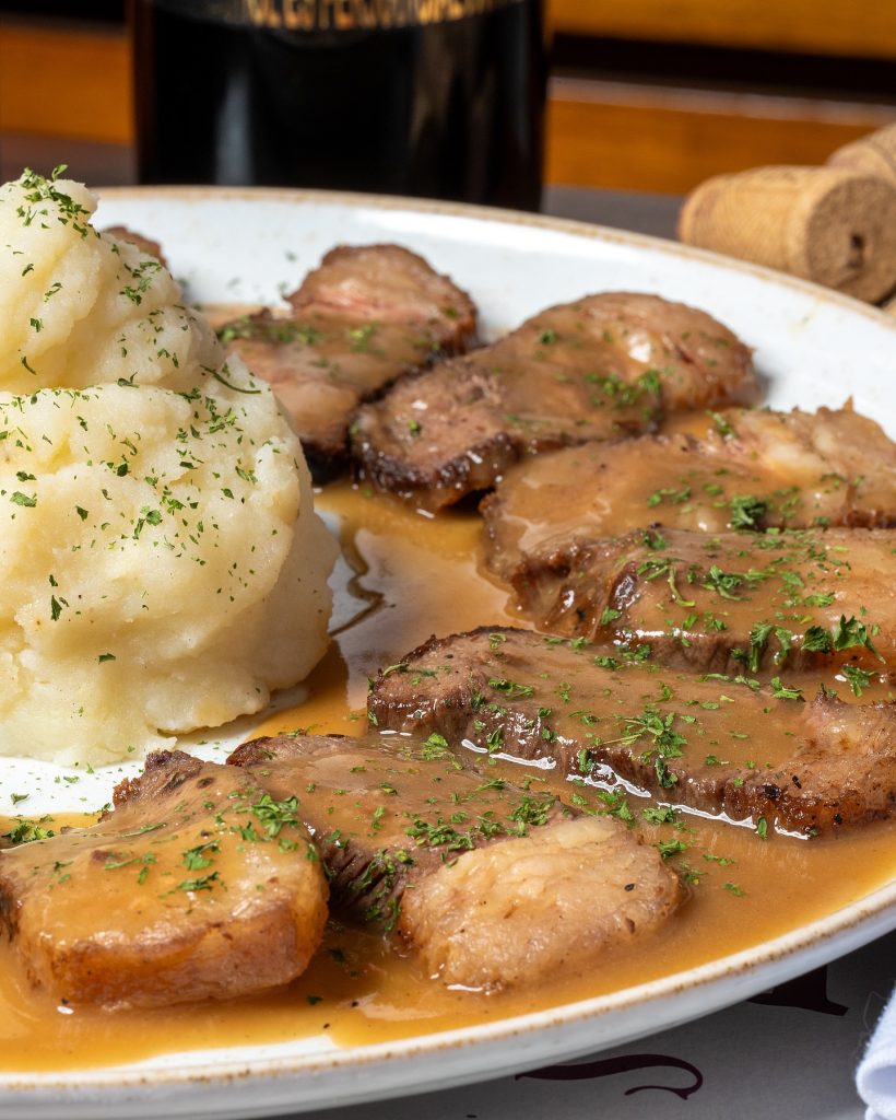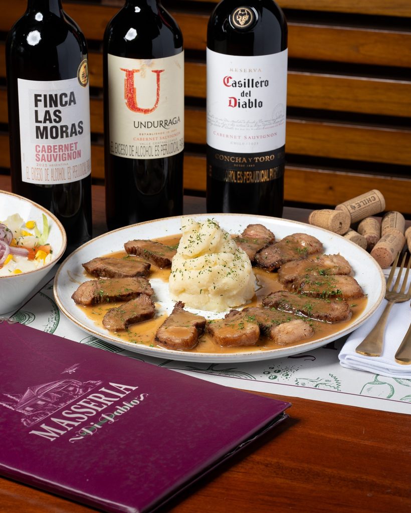vino tinto acompañado de pure y ensalada - L O M O DE CERDO